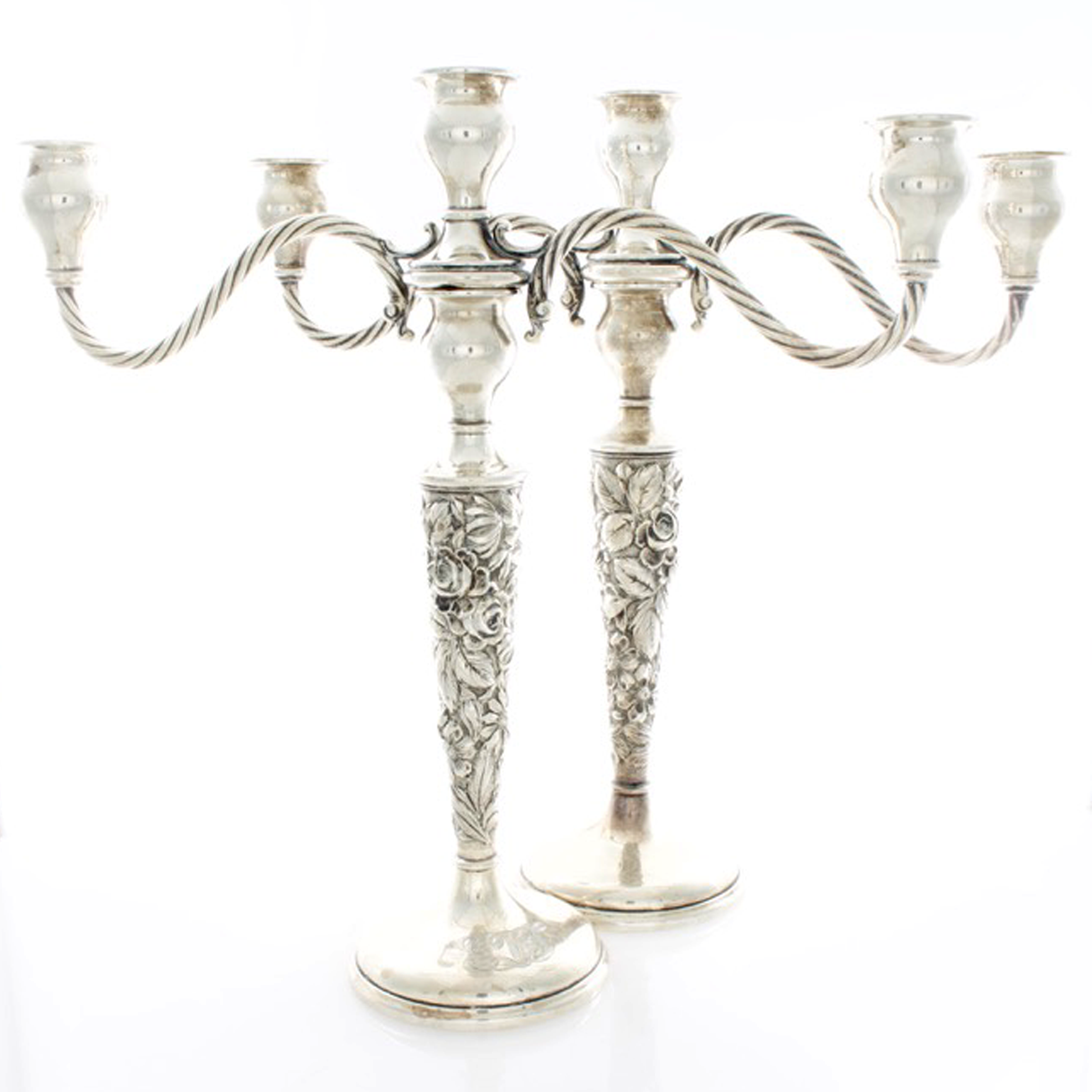 Rose By Stieff Pair Of Sterling Silver Three Light Candelabra