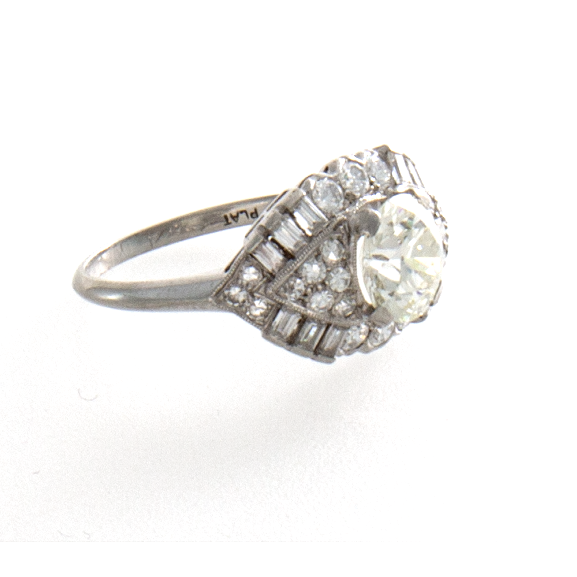 Diamond, Platinum Wedding Ring Set. Including one transitional round-cut diamond weighing approximately 1.28 ct, VS-1, J-K Color , accented by six full-cut, twelve baguette-cut and eighteen single-cut diamonds weighing a total of approximately 0.35 cttw., set in a platinum mounting, size 6 together with a diamond, platinum eternity band, size 5 3/4. {Gross Weight: 4.1 dwts}